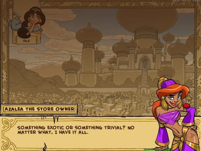 You play as a clever, opportunistic merchant tasked with a very unique job: “training” Princess Jasmine. Your choices directly shape her personality and your relationship. The game doesn’t have a traditional “character creation” for you, but your playstyle—whether you’re stern, kind, manipulative, or supportive—becomes your character. Jasmine herself is your canvas, and her stats reflect the path you choose.